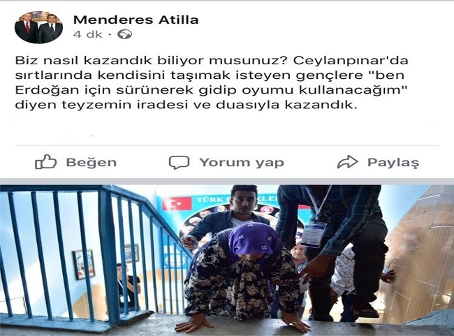 Ceylanpınar’da sırtlarında kendisini taşımak isteyen gençlere “Ben Erdoğan için sürünerek gidip oyumu kullanacağım” diyen teyzemin iradesi ve duasıyla kazandık.