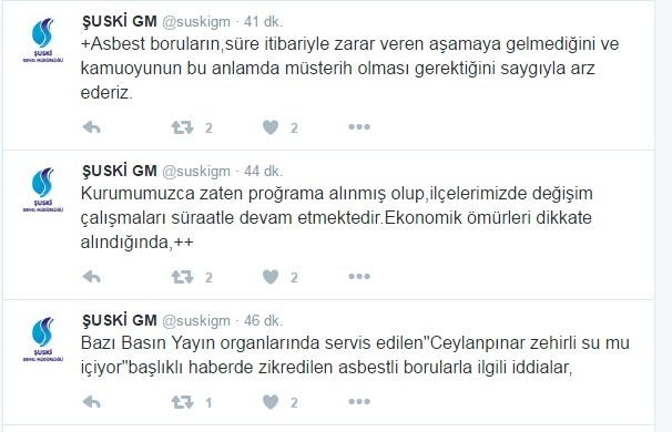ŞUSKİ yaptığı açkılamada, "Bazı Basın Yayın organlarında servis edilen "Ceylanpınar zehirli su mu içiyor" başlıklı haberde zikredilen asbestli borularla ilgili iddialar, Kurumumuzca zaten programa alınmış olup, ilçelerimizde değişim çalışmaları süratle devam etmektedir. Ekonomik ömürleri dikkate alındığında, Asbest boruların, süre itibariyle zarar veren aşamaya gelmediğini ve kamuoyunun bu anlamda müsterih olması gerektiğini saygıyla arz ederiz." denildi.