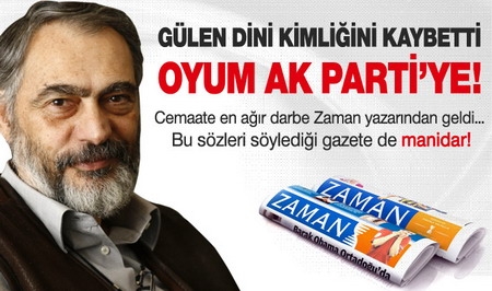 Yeni Şafak Gazetesi'nin sürmanşetten verdiği röportajda Mahçupyan, Cemaat-AK Parti savaşında safını da açıkça ilan etti. Zaman yazarı, seçimlerde AK Parti'ye oy vereceğini söyleyip, Gülen'in dini kimliğini kaybettiğini söyledi.