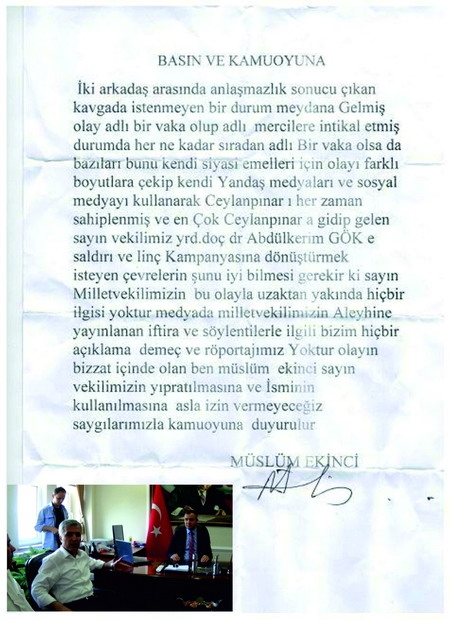 Şanlıurfa’da yayın yapan bazı yerel internet siteleri ve sosyal medyadaki bazı grupların yaşanan olayı “ İlçede büyük gerginlik, polis her iki aileyi ablukaya aldı, olaylar büyüyecek” şeklindeki başlıklarla haberleştirince, olay anında orada bulunan Reşit Ekinci’nin kardeşi Müslüm Ekinci yazılı bir açıklama yaptı.