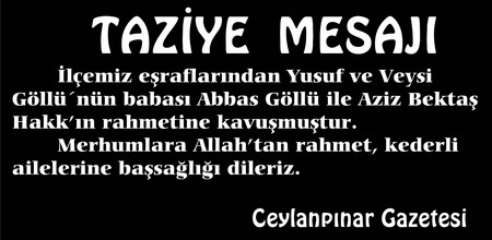 İlçemiz eşraflarından Yusuf ve Veysi Göllü´nün babası Abbas Göllü ile Aziz Bektaş Hakk’ın rahmetine kavuşmuştur. Merhumlara Allah’tan rahmet, kederli ailelerine başsağlığı dileriz. Ceylanpınar Gazetesi